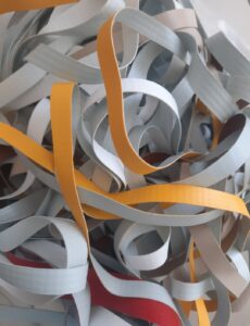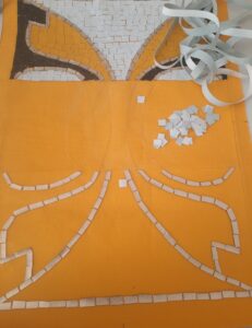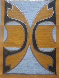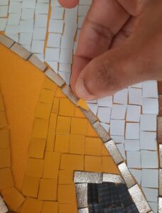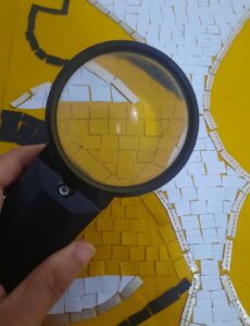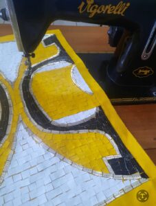 Feita manualmente com a nossa exclusiva técnica de bordado em mosaico, reutilizando resíduos plásticos, cortados em pastilhas, coladas e costuradas em tecido de algodão.