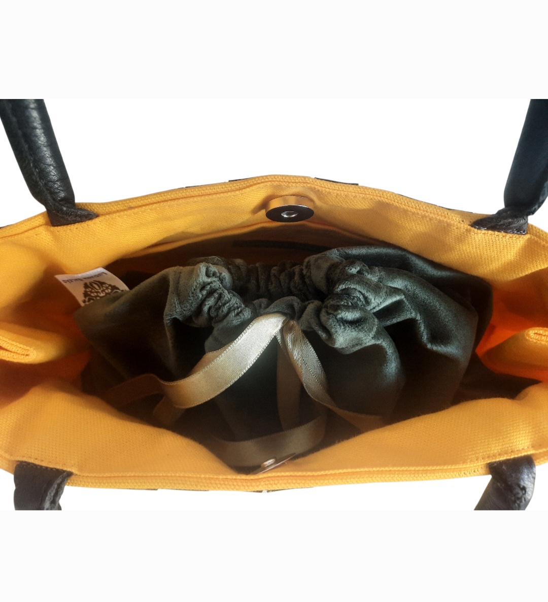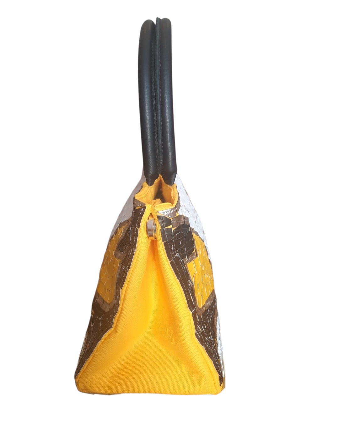 Feita manualmente com a nossa exclusiva técnica de bordado em mosaico, reutilizando resíduos plásticos, cortados em pastilhas, coladas e costuradas em tecido de algodão.